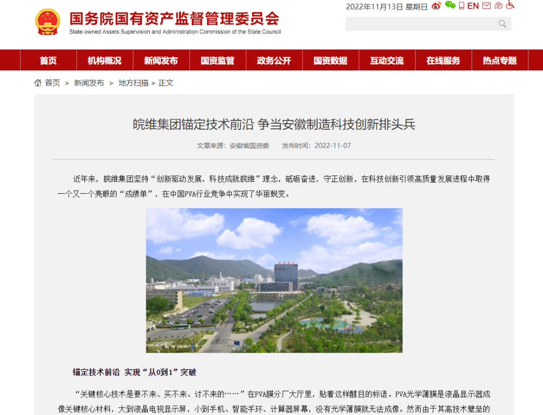 繼省國資委公眾號頭條專題報道公司科技創(chuàng)新工作后,日前,國務(wù)院國資委網(wǎng)站地方掃描欄目以《皖維集團錨定技術(shù)前沿 爭當(dāng)安徽制造科技創(chuàng)新排頭兵》為題作了深入報道。