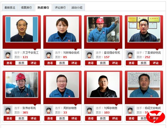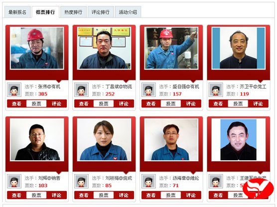 截止12月17日8:00時(shí),評(píng)選活動(dòng)歷時(shí)整整24小時(shí),有機(jī)分廠張偉得票385,為16日的得票王;黨委工作部的齊衛(wèi)平人氣關(guān)注度1177,是16日的人氣王。兩項(xiàng)指標(biāo)的前8名見(jiàn)下圖。